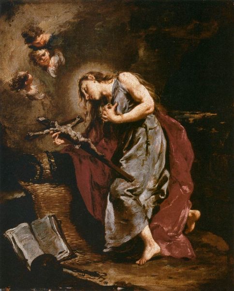 Editor: So, this is Titian's "St Jerome," painted in 1575 and currently residing in the Thyssen-Bornemisza Museum in Madrid. It’s an oil painting. There’s a lot of intensity, a sense of isolation coming from it, and the way the colors meld together…almost like a dream. What pulls you into this painting? Curator: It feels less like a dream, and more like a fever dream to me, with that visceral energy leaping off the canvas, don't you think? You feel Jerome's agony, his burning faith in the muted landscape that envelopes him. It’s the tension between that inner torment and the outside world. What strikes you about the use of color, beyond the general muted palette? Editor: Well, I notice how the red robe almost glows, drawing your eye despite the overall darkness. It contrasts so strongly. What is the meaning of that robe? Curator: It does command our attention! The red is likely referencing his position as a cardinal, yes, even in his ascetic isolation. He's chosen faith, he's *earned* that symbolic marker, and you sense it wasn’t easy. Think about the very notion of devotion—doesn't that crimson scream both love and sacrifice? Editor: That makes perfect sense. Seeing that red pop makes you reflect on how such a simple visual technique highlights the depth of Jerome’s character. Thank you! Curator: Absolutely. Titian gets under your skin, makes you *feel* the story as well as see it. Hopefully we’ve managed to unlock just a sliver of that feeling.