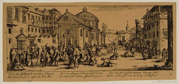 Jacques Callot made this print, "Hospitalet," in the 17th century, using etching. It's an image that invites us to consider the public role of art during times of conflict. Callot, who was from the Duchy of Lorraine, created this work during the Thirty Years' War, a conflict that ravaged much of Europe. Here we see what appears to be a military hospital, or perhaps a hospice, filled with soldiers suffering from wounds and disease. The image is incredibly detailed, depicting the grim realities of war with stark honesty. Consider the social conditions that shaped this work. Warfare was a constant presence, and institutions like hospitals were overwhelmed. Callot's print is a commentary on the human cost of conflict, acting as a visual record of its impact on society. To fully understand the print, research into the history of warfare, medicine, and social welfare of the 17th Century is essential. Art like this serves as a powerful reminder of the enduring questions about humanity.