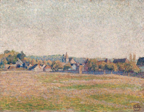 Curator: Let’s pause here at Camille Pissarro's view of the Dunquesne Basin in Dieppe. I find it incredibly captivating, almost dreamy with that morning light. What strikes you most at first glance? Editor: Well, initially, I’m drawn to the raw, material labor happening at the port – the carts, the suggestion of movement. The city in the background almost seems like a backdrop to the work of extracting a living from the land and sea. I can practically feel the rough texture of those worn wooden wheels and damp ropes! Curator: Yes, exactly! Pissarro had that touch. He could make the most mundane scene—day-to-day commerce, labor—absolutely sing with light and life. It’s an Impressionist trick, I suppose, but it really gets under your skin, doesn't it? Editor: For sure, and speaking of skin, that broken, vibrant brushwork emphasizes the materiality of the painting. It's really about transforming humble oil paint into atmosphere, labor and place. Look at those carts. You can feel their presence by only few touches. There is an extraordinary concentration here to detail of making an impressionist art. Curator: He captures Dieppe’s essence through an orchestration of light and color. You can practically feel the salty breeze and the dampness rising from the exposed basin. Even the architecture seems softened by the sun's embrace. Editor: But also hardened, weathered and stratified. I am looking at a physical description of labor and climate here. Those workers will need to maintain a landscape, but, it would never happen from its own nature. The art presents labor not as a scene or subject but more as its own texture. I think there is beauty of honesty in such form. Curator: And there is Pissarro’s real talent—showing that labor, climate and the environment is a crucial component to this life and not necessarily something else to just "add". I never tire of that incredible way Pissarro shows to respect to common, ordinary details. He teaches me a way of seeing... that what is seemingly plain hides an immense, captivating story if only you really *look*. Editor: Well said. This really highlights art's capacity to reveal something fresh about not only what is presented, but more how things become available in such presentations... even a dock worker in the basin! It opens another eye and sense to the material. Thank you for reminding of the material here today.