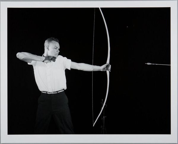 Curator: This is Brassai’s photograph, "The Kiss," a gelatin silver print taken in 1935. It captures a seemingly ordinary moment of public affection. Editor: Ordinary, maybe, but striking too. The high contrast and unusual perspective create a sense of drama. It feels intimate yet detached, doesn’t it? Like a scene observed, not participated in. Curator: Absolutely. The image appears almost voyeuristic, heightened by the subjects suspended in air, embracing in a carnival swing ride. Brassai’s work often documented Parisian street life, capturing unseen moments, especially those found on the fringes of society. He explored public and private spaces within the urban experience. Editor: That setting, a swing ride, gives the kiss a beautiful sense of precariousness. The lovers are literally elevated above everything, in their own little world for the moment, with no reference to stability. The circle formed by the ride feels significant – almost like an enchanted emblem that suspends ordinary life for this connection to flourish. Do you read a mythological reference here, with a circular motion acting as a wheel of fortune of sorts? Curator: Possibly, but within the specific context of interwar Europe and growing pre-occupation with mass entertainments, this image also encapsulates how people tried to discover, enjoy, or indeed grasp everyday pleasure even within societal anxiety. Carnival became a kind of symbolic retreat. Brassai found this tension extremely suggestive. Editor: I agree there's a push-pull happening here, a search for intimacy and normalcy amid anxiety and impermanence. I am stuck on how Brassai makes us ponder that contrast by emphasizing both the freedom and vulnerability inherent in any real expression of human attachment. The choice of a transient backdrop brings that sense of temporal tenderness to the foreground. Curator: I think we've both identified elements crucial to experiencing the work and seeing beyond surface readings here – it’s never JUST a photo of “lovers kissing." Editor: Indeed! It is instead a potent rendering of desire, escapism, and the human pursuit for realness captured by art’s ability to expose society to itself.