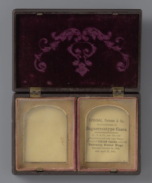 Editor: This is "Chimney Scaffold" by J. Jeane, dating from 1860. It looks like a print, perhaps an engraving or etching on paper, displayed in a rather ornate case. I am immediately struck by how modern it feels for something from the mid-19th century. What's your read on it? Curator: It is peculiar, isn't it? Almost brutal in its starkness, despite the pretty gilded frame. It's as if the artist is saying, “Here’s the bare bones of industry, of progress." I see a statement on urban growth, perhaps a commentary on what was considered aesthetically valuable in that era. It invites a meditation on industry's impact and it also is interesting because we don't often elevate the simple architectural study to the level of displayed artwork. Editor: Do you think it could be critical of industrialisation, rather than celebrating it? I mean, that lone chimney…it almost feels melancholy. Curator: Perhaps a little of both. Isn't that so often the case? A bit of melancholy mixed with forward ambition. Those things do coexist. What sort of space would you imagine this chimney being attached to? Is it a factory, a dwelling? The composition certainly leaves you to wonder. Editor: That's a great question! I’m so focused on the lone chimney itself; it's made me completely neglect any architectural context. Curator: It also demonstrates how, in the right hands, a seemingly mundane subject can become quite profound. And there’s something really touching about the maker of the red display case having their name elegantly displayed and embossed in the textile. The creation of the framing is an important element too. I almost feel a deep sense of appreciation for Jeane and the artistry that Jeane showed the world. What did you learn today, from old Jeane? Editor: Definitely! It has completely changed the way I will now be observing and interpreting architectural-based pieces in the future. Thanks!