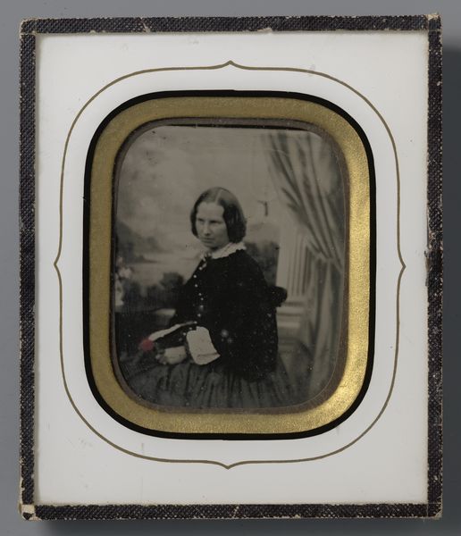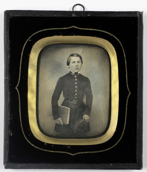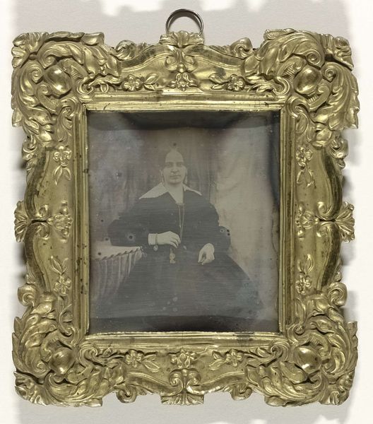 This portrait of an unknown man was created by Leroux, an artist born in the 18th century. Note the oval form which encapsulates the sitter, framed by gold against the stark, contrasting black background. This immediately draws the eye inward, focusing our attention on the subject's face. The sitter’s gaze is directed slightly off to the side, perhaps suggesting introspection or contemplation. The artist's use of light and shadow, particularly on the face, adds depth and dimension, creating a sense of realism. But it is the material contrast which is most striking: the metallic gold against the black background. The work prompts us to consider the interplay between art and representation, and it raises questions about identity, memory, and the passage of time. In essence, this portrait is not just a record of a man's appearance; it's an invitation to engage with broader philosophical inquiries about existence and representation.