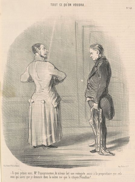 Curator: This drawing, created in 1865 by Johan Michaël Schmidt Crans, is a political cartoon. It's rendered in ink on paper, reflecting both realism and elements of Romanticism. Editor: My first thought? The stark simplicity. It's just two figures, outlined against...nothing much. A quick sketch capturing a moment, almost theatrical. Curator: Indeed. The artist's work, entitled "Spotprent op de pogingen van Rochussen het kabinet te doen vallen," directly critiques Rochussen's attempts to undermine the cabinet, highlighting the political climate of the time. Editor: Rochussen, huh? Well, he looks exasperated, doesn't he? Trapped by his own ambitions. The other figure, presumably representing the cabinet, seems equally stuck in place. A bit like a tragicomic dance. Curator: The composition reflects the power dynamics at play. Notice how the lines of their bodies and gestures create a sense of impasse? The setting is sparse, putting all the emphasis on their interaction. Editor: I get a real sense of frustration. They're almost touching, reaching for something just out of grasp. That blank background amplifies that feeling of isolation. Curator: The drawing serves as an important document, revealing how political tensions were visualized and circulated in public discourse. The choice of caricature underscores the desire to ridicule and critique those in power. Editor: It’s funny how these struggles echo down the years, isn't it? That tension between wanting to push forward and being stuck fast, still so relevant. The little handwritten note just above their head amplifies that sentiment. "A new idea." Curator: Precisely, it offers a window into understanding the sociopolitical history embedded in art from this era, where artists served as commentators and critics. Editor: This drawing does something very subtle; capturing not just the political situation, but the deeply human element of ambition, failure and disillusionment, which in turn speaks volumes. Curator: Ultimately, this drawing by Johan Michael Schmidt Crans invites reflection on enduring themes of power, conflict, and the cartoonist's role in challenging authority. Editor: And it reminds us that sometimes, the most powerful statements are made with the simplest of lines.