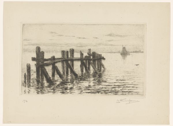 Editor: Here we have Carel Nicolaas Storm van 's-Gravesande’s etching, "Pier van Vlissingen," created sometime between 1851 and 1924. The monochromatic landscape feels very bleak and serene to me at the same time. What stands out to you when you look at this print? Curator: Immediately, the repetitive nature of the pier's posts catches my eye. Notice how the artist uses a series of vertical lines to create a sense of rhythm. They evoke a feeling of both resilience and decay – those pilings stand firm against the constant battering of the waves, yet they’re clearly weathered by time. Does this juxtaposition resonate with you? Editor: Absolutely, the rhythm makes me think about time and weathering. There’s that lone sailboat on the horizon, too, so small compared to the pier. Curator: Yes! The sailboat becomes a powerful symbol. What do you think it symbolizes? Editor: Perhaps human ambition against the immensity of nature? Or maybe a sense of longing or adventure? Curator: Precisely. The pier itself represents mankind’s attempt to tame the sea, but nature always exerts its dominance. It’s an etching, which traditionally is about transferring knowledge and a kind of exactitude, yet there's all this powerful, ambiguous feeling coming through, right? Editor: It’s fascinating to consider those competing intentions. I initially only noticed the quiet beauty, but I see it as more dynamic now. Curator: And that's the power of art, isn't it? It allows for multiple interpretations, revealing new layers with each viewing. It carries these layers of human intention across time. Editor: I'll definitely carry those reflections forward as I look at more art. Thanks for sharing your expertise!