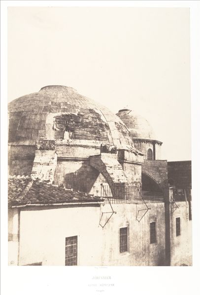 Curator: Look at this mesmerizing 19th-century daguerreotype by Auguste Salzmann, created between 1854 and 1859, called "Jerusalem, Valley of Josaphat, Details of Absalom's Tomb." The level of detail is amazing for such an early photographic process. Editor: It feels hauntingly serene. The weathered stone and somber tones lend it an air of melancholic grandeur. The structure dominates the frame. There’s something unsettling about its isolation. Curator: That isolation, I think, amplifies the Tomb’s symbolic weight. It's not just a tomb; it’s a visual representation of fragmented historical and religious narratives. Absalom, in Jewish, Christian, and Islamic traditions, is a figure of rebellion against his father, King David. Editor: And the damage to the structure becomes another layer to the story—it almost feels vandalized. This image exists, for me, at the intersection of religious narrative, power, and acts of resistance. This could reflect not just biblical history but also contemporary power dynamics in Jerusalem. The very act of photographing it could have political implications. Curator: Photography then was also about verification. Salzmann was commissioned to photograph biblical sites, providing visual ‘proof’ and potentially reinforcing certain religious narratives. This adds another dimension to your argument. We need to understand photography as a means of constructing as much as it documents a cultural narrative. Editor: Exactly. Looking at how light and shadow play across the monument, it looks both eternal and vulnerable. It calls into question how we frame the history of ancient cultures when viewed through a Western, colonial lens. Who gets to tell the story? Who benefits? Curator: And isn't that the perennial question when confronting images from the past? The tomb becomes a canvas onto which centuries of interpretations and power struggles are projected. What seems static is actively engaged in a very dynamic exchange with history. Editor: This photograph reveals just how relevant our interpretations are today, allowing for necessary and challenging contemporary dialogues. It is more than a simple visual artifact, it is a conduit for historical revision and conversation.