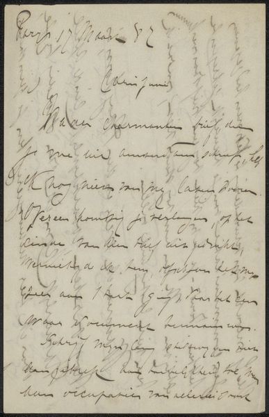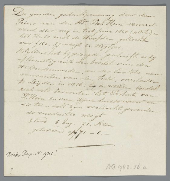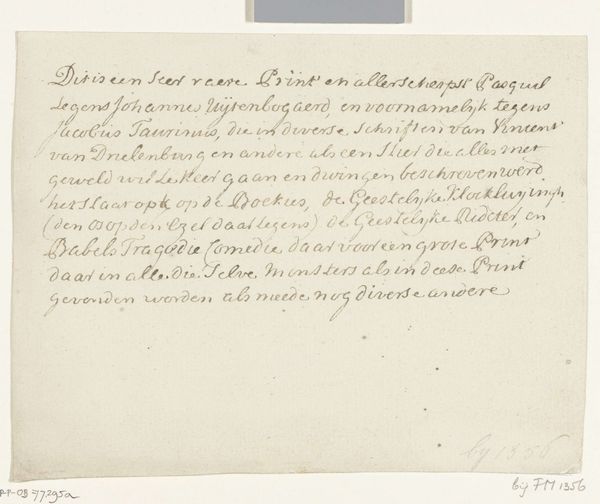 Curator: This piece is titled "Briefje over het waarnemen van een preekbeurt," which translates to "Note on the Observation of a Sermon." It's believed to be from around 1782, crafted by Johannes Hooyman. Editor: Right away, I’m struck by the intimacy of it. The aged paper and delicate script give it this ghostly, personal feel, like a whisper from centuries past. Curator: Precisely! The use of ink on paper lends it an immediacy, a sense of capturing fleeting thoughts. It's almost like eavesdropping on a private moment. Editor: The calligraphy is lovely, even with its quirks. It feels less about perfect legibility and more about the rhythm and flow of the words. Do you find it's designed for functional communication or decorative aesthetics? Curator: I'd lean towards functional with artistic flourishes. Hooyman seems primarily concerned with recording his thoughts, but there's a definite aesthetic consideration in the way the text is laid out on the page. It's a document, sure, but also a small work of art. It sits somewhere between storyboard sketches and sketchbook art. Editor: It's fascinating how the everyday act of note-taking can transform into something so compelling over time. Does the text provide insight to what those everyday activities are? Curator: In examining the intimist details, the drawing serves as a glimpse into 18th-century life, offering a unique perspective on faith and personal reflection, detailing observations of what to do after attending a sermon. Editor: Seeing those private reflections in this raw, unpolished format gives a whole new dimension to the piece. It makes it timeless. The imperfection is part of what makes it so perfect. Curator: It's a humble testament to the enduring power of simple expression. It’s aged paper, it’s hand-drawn type, it's so accessible. I find something incredibly poignant in that.
