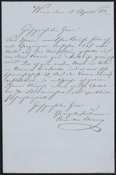Curator: We are looking at "Brief aan Kunstverein in Bremen" - Letter to the Bremen Art Society – a drawing in ink on paper, potentially from 1856, by Remigius Adrianus Haanen. Editor: Immediately striking is the elegance of the script itself! The visual rhythm it creates, the flow and curl of each stroke. It feels performative, almost like a dance in miniature. Curator: Yes, and the act of writing a letter to an art society in the mid-19th century carries significance. These societies played a crucial role in shaping artistic taste and patronage. They acted as cultural gatekeepers, influencing which artists received recognition and support. Editor: I’m drawn to how the flourishes add another layer of meaning; the way the script swells with confidence. Haanen is establishing his status, seeking to enter the conversation among respected circles. Are there visual cues related to his ambitions? Curator: Exactly. The letter functions as more than just correspondence; it's a performative display of skill and status. Haanen's mention of his knighthood – "Ritter des R. niederl; ordens der Eichenkrone" – served to bolster his credentials. He wants to ensure he will be taken seriously by the society. Editor: And does the text, in translation, provide further insight? Certain letter forms may have held specific meanings, signaling artistic affiliations or philosophies beyond mere communication. Curator: In the text, Haanen offers a picture that "hopefully suits." It hints at anxieties of reception, of the constant dance between artist, artwork, and the art world structures deciding what counts as valuable. It reveals the human element beneath the gilded frames. Editor: There's a poignancy to seeing this direct appeal for validation. He puts himself before an institution, a reminder of how even established figures navigate established power structures. Curator: Precisely. And Haanen's letter serves as a snapshot of that intricate network, illustrating the social dynamics that influence artistic success. It humanizes history, reminding us that the canon is made by very human negotiations. Editor: Reflecting on it now, the calligraphy reads not merely as handwriting, but as a cultural artifact. Curator: It captures an instant within broader structures, that blend self-promotion and artistry. A humble picture that reveals the very mechanisms of reputation making.