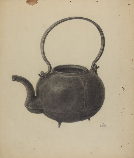 Editor: This is Frederick Jackson's "Iron Tea Kettle," a pencil drawing from between 1935 and 1942. There's a quietness to it, almost meditative. What stands out to you when you look at it? Curator: The deliberate choice of an iron tea kettle, during that specific period, resonates with particular social narratives. It is rendered with a very clear intention for distribution in an institutional setting, suggesting an examination and validation of ordinary objects and life, but I'm struck by the absence of the human element. Why do you think he chose this object, and this specific medium? Editor: Perhaps because it’s such a common, everyday object? Choosing pencil makes it feel more accessible. A way to elevate the mundane? Curator: Precisely! Think about the socio-economic context. The '30s and early '40s saw massive social upheaval. Elevating a simple tea kettle, mass produced in the early days of industry to such meticulous detail offered a silent commentary. But accessible to whom, and displayed where? How does that influence our viewing? Editor: Good question! I guess an exhibition would put it into a different perspective and maybe offer it to someone as high art. It makes it more valuable and important. Curator: And it is by these means of cultural infrastructure – galleries, collections, art educators – that value and importance are culturally manufactured and reinforced, a lens through which an everyday object, rendered in pencil, becomes an object of significant contemplation, and, by association, its viewers become people of cultivated significance. Editor: I never thought of it that way, but it does seem to imply more than just its face value. It prompts questions about access, the politics of display and ultimately, what we consider "art". Curator: Indeed. Seeing beyond the immediate aesthetic invites us to critically assess art's role within the broader societal framework. Editor: Thank you for providing such a different perspective! It's amazing how much historical context shapes our understanding of a simple drawing.