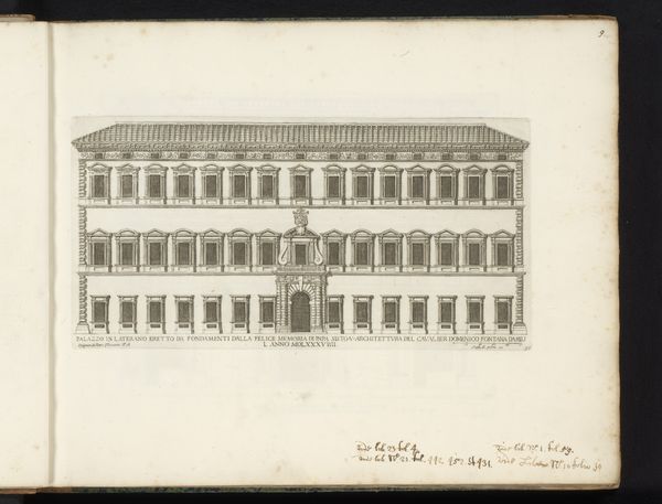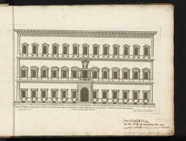 Curator: Editor: Here we have Giovanni Battista Falda's "Façade van Palazzo Spada," created after 1655. It's a print made with ink on paper. It has this incredible, almost regimented feel, due to the rigid lines. What’s your take on this piece? Curator: From a materialist perspective, consider the conditions that made this image possible. Falda's print, multiplied and distributed, served a purpose. Editor: What purpose are we talking about here? Curator: It disseminated knowledge. It showcases Baroque architectural ideals through readily available prints. This challenged the dominance of unique, "high art" objects. Notice how the act of engraving itself – a meticulous, repetitive labor – mirrors the ordered design of the Palazzo. Do you think the availability and consumption of images like these influenced architectural trends? Editor: That’s an interesting point. It suggests architecture wasn't just dictated by wealthy patrons or the singular visions of architects, but also by what could be circulated and replicated through prints. Could it influence builders? Curator: Exactly! The Palazzo Spada, realized in brick and stone, became accessible as ink on paper to a broader audience. Also note, printmaking created labor opportunity. Editor: It's fascinating to think about how this seemingly simple print is a product of so many hands. Curator: Yes. Looking closely helps reveal complex ideas of artistic labor and widespread access to architectural trends of the period.