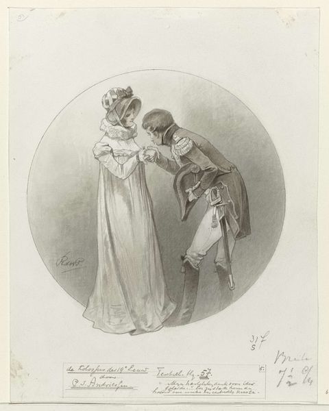 Laurent Guyot made this print, titled *Couple amoureux à la promenade*, in 1798. As part of a series of fashion plates, it captures the sartorial tastes during the French Directory, a period of radical change following the French Revolution. The print depicts a couple on a stroll, embodying the era's evolving ideals of beauty and social roles. Her high-waisted dress, inspired by classical antiquity, symbolizes a break from the aristocratic excesses of the Ancien Régime. His tailored coat and cravat suggest a more restrained masculine elegance. The intimate composition hints at shifting gender dynamics, with the couple appearing as equals in their leisurely pursuit. Yet, the print also speaks to enduring class distinctions, showcasing the refined attire of the bourgeoisie amidst a society still grappling with inequality. Guyot's fashion plates offer a glimpse into a world in transition. They reflect a yearning for a new social order while revealing the complexities of identity in a revolutionary age.