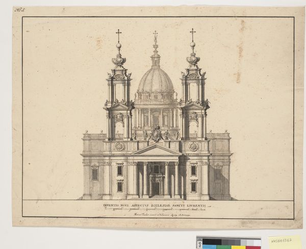 Curator: This is Sidney Robert James Smith’s “Project for the Facade of the Tate Gallery.” Note the precise detail of the architectural rendering. Editor: It feels almost dreamlike, doesn’t it? So grand and orderly, yet also somehow...unrealized. Curator: Indeed. Consider the context: Smith, born in 1857, was working within a Victorian architectural tradition obsessed with Neoclassical grandeur and order. Editor: The repeated angelic figures feel significant, reinforcing the idea of this space as a temple, or a sacred place, dedicated to the arts. Curator: Absolutely. The proposed design carries the weight of British imperial ambition and cultural projection in this period. But the Tate we know, of course, took a very different form. Editor: Still, Smith’s project captures the aspirations embedded in the gallery's founding: a testament to national identity and artistic legacy. Fascinating. Curator: A compelling counterfactual vision of the Tate’s identity.