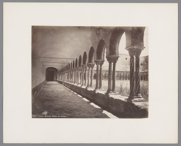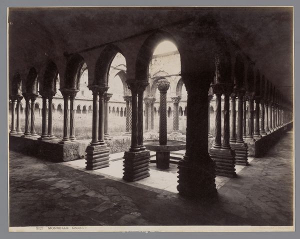 Editor: This albumen print, "Zuilengalerij van de kathedraal van Monreale, Sicilië," by Giorgio Sommer, made between 1870 and 1890, has a really striking perspective with these endless rows of columns. The stark contrast creates such a serene, almost hypnotic effect. What's your interpretation? Curator: The endless colonnade in Sommer’s photograph speaks to a cultural memory of power and spirituality. Consider the column itself – a symbol reaching back to ancient civilizations, embodying stability and aspiration. What feeling do the repetitive geometric patterns etched on the columns evoke in you? Editor: They almost remind me of a coded language or a sort of…spiritual rhythm? Curator: Precisely. The patterns aren’t merely decorative. They act as visual echoes of prayers, incantations, or moral lessons. The fountain becomes a purifying center, a symbol of spiritual cleansing, reinforced by its strategic placement, no? The play of light and shadow, rendered exquisitely in this photographic medium, enhances this contemplative mood, connecting us to centuries of faith and architectural ambition. Do you agree? Editor: I do, especially noticing how the perspective almost diminishes the physical form of the fountain. Curator: Sommer uses perspective here as a means of guiding the viewer's eye and spirit towards the implied divine. These aren't simply structural elements; they're loaded with layers of cultural meaning that continues to affect us. Editor: It’s amazing how the mundane, columns in this case, can take on such profound meaning. I'll never look at architectural photography quite the same way again. Curator: And that's the enduring magic of cultural iconography! We start seeing the whispers of the past in plain sight.
