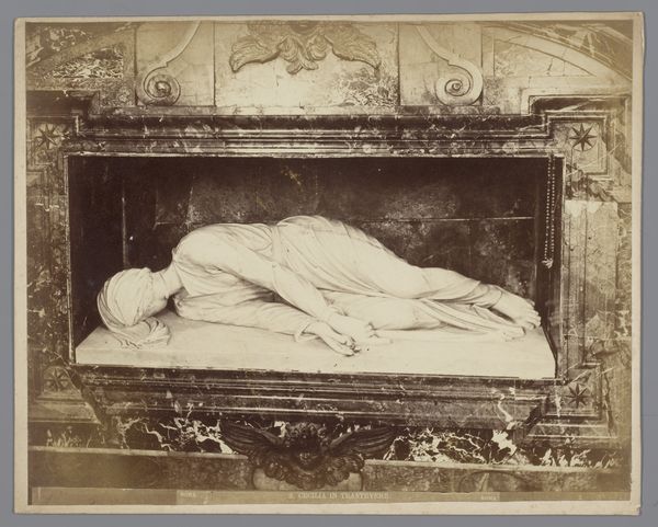 Curator: I find myself immediately struck by the melancholic stillness of this photograph. There's a sense of somber dignity, even behind the forbidding fence. Editor: Indeed. What we are seeing is a photo from 1911 depicting the tomb of Jan Hendrik van Kinsbergen, a Dutch naval hero, inside Amsterdam's Nieuwe Kerk. It memorializes a complex figure who was both celebrated and critiqued in his time. Curator: Complex indeed! You get the feeling there's a whole novel hiding beneath that stone effigy. The way the light catches the folds of his robe almost makes it seem he’s about to rise. Editor: The memorial, itself, speaks volumes. Kinsbergen, celebrated for his naval victories and service to the Dutch Republic, also represented the complicated legacy of colonialism and its profits. He profited considerably from colonial resources which is certainly at odds with our current perspectives and thinking around historical accountability. Curator: You know, I’m also taken by the photographer's choices here. They've intentionally framed the monument through the iron bars, which gives a feeling that access to the real story of Kinsbergen is blocked and that he remains both literally and figuratively 'on a pedestal.' Editor: That feels accurate. Monument culture has gone through many changes as have its interpretation. Memorials reflect not just an individual but shifting socio-political values. Who do we choose to immortalize in public spaces? The monument forces us to question our definition of hero. Curator: Which leaves you musing on heroism. Kinsbergen obviously represented a certain version of that in his time. The quiet permanence of the monument suggests a man of enduring influence, or, at least, enduring presence. But history always asks us to reconsider our heroes, doesn't it? Editor: It absolutely does. Monuments aren’t passive relics; they're active participants in conversations about national identity, historical narratives, and the ethics of remembrance. In this case, what values we consider to be most virtuous is something which must constantly be debated and questioned, or history runs the risk of repeating itself.