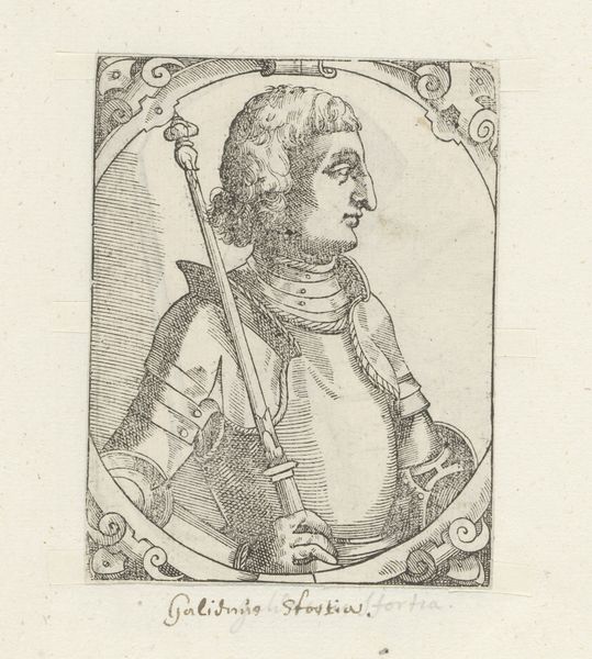 This is a portrait of Alessandro de' Medici, created by an anonymous artist, its fine lines etched into a small rectangular plate. The cross-hatching creates both form and tonal depth. Consider how the subject's armor isn't merely decorative; it defines his presence within a rigid social structure, indicative of power and authority. The composition places Alessandro centrally, framed by an ornate border that both contains and emphasizes his figure. This symmetrical arrangement suggests stability, but look closer: the slight asymmetry in his gaze and posture introduces a subtle tension. Such formal choices reflect the complexities of representation, where power is constructed through calculated visual cues. This portrait, with its detailed lines and careful arrangement, engages with enduring questions about identity, power, and the ways they are visually encoded.
