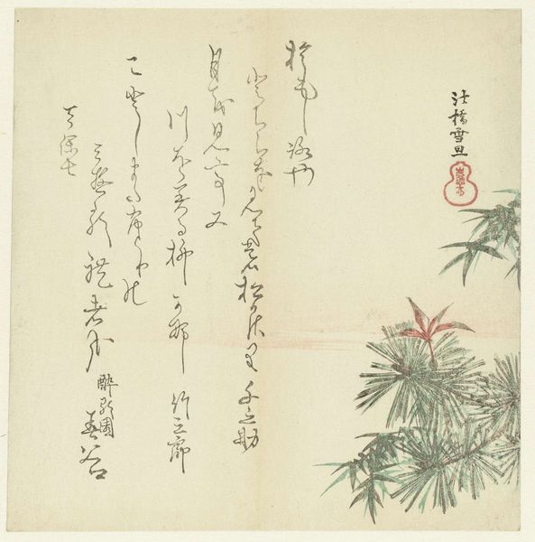 Curator: This is a print from the 1850s called "(Autumn flowers and singing insects)" by Kō Sukoku II, currently housed at the Minneapolis Institute of Art. It's primarily made of ink and print, but what I notice first is the interesting linear composition featuring what looks like a procession of insects. What captures your attention? Editor: Well, besides the charming insect parade, I'm drawn to how delicate it feels despite the everyday subject. What do you see in this piece beyond the immediately visible? Curator: I think it’s crucial to examine this work as an etching - consider the physical labor of creating the plate, the conscious decisions around line weight to create texture and depth using primarily line, how it would have been printed. Then let's ask, why insects? Were insects popular as a motif for mass consumption through ukiyo-e prints? How does this particular composition challenge traditional landscape paintings? It really brings forward a different perspective from which we would assess similar art, say from the Edo Period. Editor: So you're thinking about it not just as art, but as a product of labor and cultural exchange. That's really interesting. I guess I was focusing on the aesthetic qualities of it, whereas you immediately went to the means of production. Curator: Exactly! The choices the artist makes, even down to the ink and paper, tell us so much about the socio-economic forces at play. Editor: I never would have thought about it that way. Considering this as part of a wider landscape of material production changes how I see its value. Curator: Absolutely. The material informs the meaning and helps us break away from only appreciating a beautiful image to interrogating how it came to be and what it represents within its historical context. Editor: Okay, I definitely have a lot to think about now in terms of how art is both a commodity and something with inherent aesthetic value. Thanks for your time!