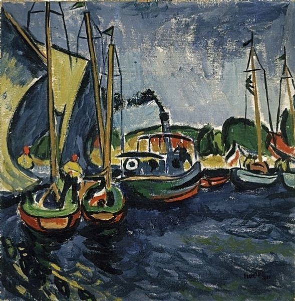 Georges Braque created “The Port of La Ciotat” with oil on canvas, presenting us with a dazzling array of colors and forms. The composition is immediately striking, with its bold arrangement of shapes representing boats, buildings, and the harbor itself. The materiality of the paint is evident in the thick brushstrokes, lending the scene a vibrant, almost tactile quality. Braque’s use of color is particularly noteworthy. The buildings are rendered in unexpected hues of pink and lavender, while the water reflects a mosaic of greens and blues. This approach to color creates a sense of dynamism and challenges conventional representation. The overall effect is a destabilization of established categories of representation, pushing the boundaries of how we perceive space and form. The structural elements within the painting, such as the juxtaposition of contrasting colors and the interplay of geometric shapes, suggest an engagement with semiotic systems. Braque invites us to decode these visual components, moving beyond surface appearances to uncover underlying structures of meaning. “The Port of La Ciotat” functions as a site of ongoing interpretation.