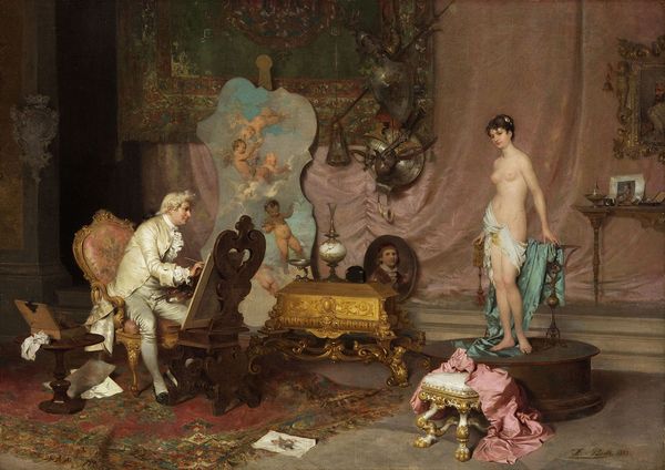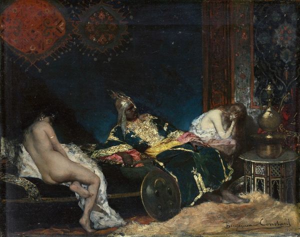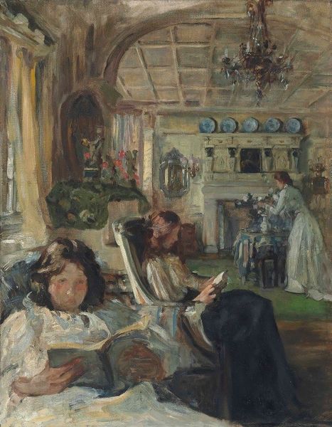 Curator: Right now we're looking at Mihály Munkácsy's "Paris Interior," created in 1877, currently held at the Budapest Museum of Fine Arts. Munkácsy, though Hungarian, made Paris his artistic home, and this piece really captures a certain...ambiance. Editor: Ambiance is a great word. My first thought is actually how *stuffy* it feels, but also how immersive. Like stepping into a memory that's been softened by time. Curator: That's interesting! Because for me, it has this lovely sort of faded glory, you know? There's the woman in her exquisite dress, the rich textiles... It's almost as if we’re peering into a private world. Editor: Exactly, and whose private world is this, right? The setting oozes bourgeois comfort, privilege even. The woman reading, the child playing obliviously… This is leisure constructed on labor. Curator: Well, you're right, of course. The trappings *do* signal status, undeniably. But I’m more caught by the play of light, the painterly textures. Notice how the eye moves through the receding spaces of the rooms, lured by soft light? It almost evokes a hazy dreamscape. Editor: Absolutely, technically masterful! And beyond light and shadow, the painting also subtly portrays 19th-century gender roles. The woman indoors, presumably occupied with domestic duties, contrasted with the implied, unseen world of men outside those curtained thresholds. Curator: That's a good point. You know, I find myself wondering about what she’s reading, what emotions the letter brings to her? There’s this wonderful ambiguity, we are left to construct the whole story ourselves. Editor: Agreed. The reading woman as a kind of canvas upon which the viewer projects their narratives. And that sweet little toddler! Carefree childhood innocence framed by oppressive affluence, maybe? Curator: Oppressive, hmm? Perhaps a tad dramatic! But point taken about those multiple interpretations dancing there! I find that rather marvelous. Editor: Art's purpose. This painting invites a deeper consideration about the intricate relationship between representation, power, and those fleeting intimate glimpses we see captured here. Curator: A sentiment, I can heartily endorse, as it stirs me into dreams of paint, dreams of long ago, stories we will never know. Editor: Indeed, may those visions stir and inspire, prompting a little wakefulness as well.