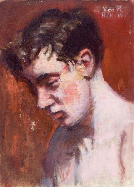 Curator: Here we have Denman Waldo Ross's "Portrait of a Young Man," currently residing at the Harvard Art Museums. It's an intimate piece, roughly 14 by 10 inches. Editor: It gives the feeling of a memory, doesn't it? The colours are all blended and warm, but that single, bright blue eye seems to pierce through the haziness. Curator: Absolutely. Ross was deeply interested in colour theory. That single flash of blue against the browns and pinks isn't accidental; it draws the eye and creates a focal point that is both vulnerable and captivating. It’s a visual anchor. Editor: It's almost like the artist is trying to capture the ephemeral quality of youth itself. That intense gaze, the delicate brushstrokes forming the face...youth is fleeting, vibrant, here for a moment, then gone. Curator: Ross sought beauty and order in the world through his art. I think this portrait reflects his desire to capture the essence of the subject. Editor: Perhaps it’s also a reflection of Ross's own search for something lasting. A memento of a moment, a feeling, a person.