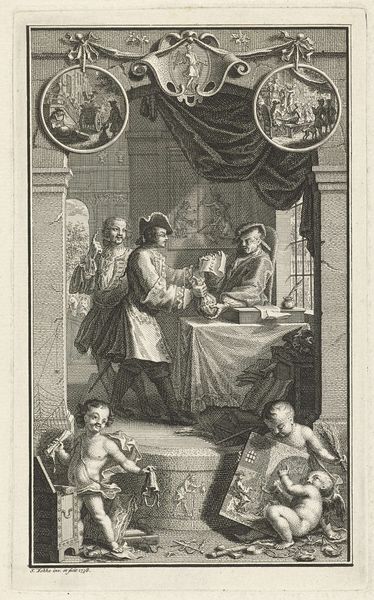 Curator: Look closely at this engraving, "De Middagh/Le Midi," created between 1702 and 1726. Its attributable to Pieter van den Berge and the medium is print engraving. It resides in the Rijksmuseum. What’s your first impression? Editor: Struck by the texture. Look at all the labor involved in that hatching, creating such detailed, intimate interior from just lines. The clothing folds, the wall tiles… so much handiwork, but almost austere in mood? Curator: The scene depicts a midday meal. Observe the people gathered; it offers an interesting peek into domestic life of the period and it really captures a specific moment in time. Editor: Precisely. Domestic, but who produced what we see? Silverware, pottery on the shelves. Someone mined that silver, a potter shaped and fired those vessels, the fabric dyed and woven... this little genre painting hides so much production. The work happening beyond this scene. Curator: It’s intimate, isn't it? Consider that domestic tranquility idealized but surely those goods came from elsewhere... It begs the question, what compromises and inequalities are built into those "pleasantries of life?" But the printmaker translates them and we contemplate. The way the light is depicted as well! So detailed... Editor: Absolutely, look at the casual luxury. Consider this an artwork speaking to consumption itself – or a warning about being over-consuming. Food, tableware... how much *stuff* they've accrued. What materials they valued, what they didn’t see. That tells its own tale. The paper itself would've been luxury for many as well. Curator: Perhaps! It does reflect our current discussions about our footprint on the world, I suppose. Still I appreciate this small scene as a meditation on time, families and what it is to have lived back then. Editor: Definitely. Something about viewing art like this allows us to really think deeply about what it represents socially and materially, and question all of our relations and responsibilities.