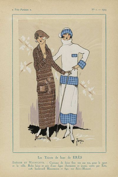 George Barbier made this gouache on paper sometime in the early twentieth century. The illustration feels like a study in contrasts, the man’s stark tuxedo against the woman's elaborate fur-trimmed gown. Look at that gown - the painterly pattern seems to blossom with a life of its own, a loose rendering of shapes and colors that brings a tactile sense to the figure. The dark inky blues against the warm reds and greens are so vibrant and alive! The flat planes of color and the stylized figures remind me of other artists like Erté, or even a bit of Matisse. The work embraces a sense of style and decoration. It's all about capturing a mood and an era, rather than aiming for a perfect representation. The illustration is like a conversation, a mix of the old and the new, where the artist's personal touch makes it all come alive.