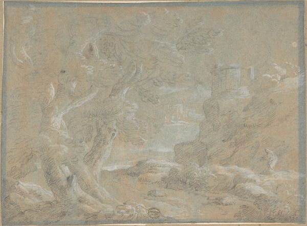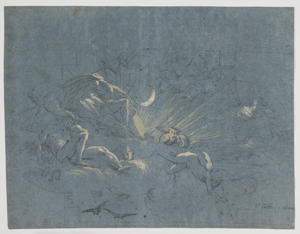 Curator: This drawing, held in the Städel Museum's collection, is by Pietro da Cortona, and it’s titled "God Destroys the Instruments of Martyrdom of Saint Catherine." Editor: My first impression is chaos, really. A jumble of figures and shapes. It feels almost violent, even though it’s rendered in what seems like soft chalk or pencil. Curator: Exactly, a medium such as chalk softens the blow, even as it illustrates such a visceral subject! Cortona's Baroque style often employed preparatory sketches to organize complex narratives, which in this case looks at the legendary Catherine of Alexandria, martyred for her Christian faith. What interests me is the choice of imagery here: Catherine's oppression stands in defiance of modern power structures. Editor: Oppression is definitely communicated, I see instruments of torture splintered mid-air. Symbolically, the breaking of these instruments tells a story about the limits of worldly power. Even if one could read these torture devices as signifiers of worldly violence, those instruments of torture represent a failure of their intended function. The jagged edges suggest divine intervention as well as human cruelty. Curator: This sketch serves as a testament to faith's resilience. Think of the ongoing legacy of patriarchal systems: examining visual narratives such as this through an intersectional lens shows not only their context, but allows modern parallels in gender inequality to appear within the picture's construction of female suffering. Editor: I think beyond the obvious themes, the rising cloud is essential; this shape also evokes the release from earthly constraint. It could represent both divine judgment and a move from human torment. Catherine rises with an air of defiance. I imagine it serves a visual metaphor for spiritual liberation triumphing over brute force. Curator: Indeed! Considering art as a reflection of larger sociological trends allows one to examine questions about representation and power dynamics. The martydom story here isn’t simply about a historical figure; rather it points toward ongoing cultural conversations around religious authority and bodily autonomy in our world. Editor: Studying images of martydom through time, one can better examine faith across the cultural and personal realms. As we trace how similar icons resurface and shift meaning, perhaps their symbolism teaches that a visual motif may continue to speak—but, thankfully, their social force may diminish!