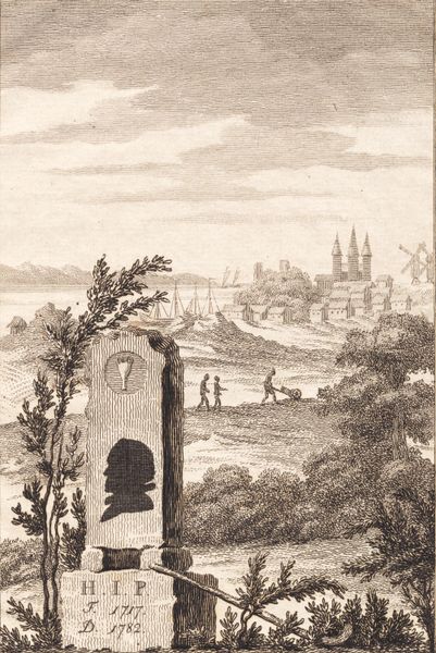 J.F. Clemens created this engraving, "Mindestøtte for Hans Jakob Paludan", which translates to "Memorial for Hans Jakob Paludan," as a frontispiece, employing line, texture and form to shape our understanding of memory and place. The composition layers foreground, middle ground, and background to create a sense of depth. In the foreground, a memorial stands adorned with symbolic engravings, juxtaposed against a backdrop of the town of Kalundborg. The artist uses contrasting textures – the rough-hewn stone of the monument against the softer rendering of the landscape – to draw the eye. Look closely at the monument, where the silhouette and the goblet reference Paludan's life and perhaps his scholarly pursuits. The meticulous detailing, achieved through fine lines, invites reflection on the relationship between memory, representation, and the physical world. This engraving functions as both a commemoration of an individual and a representation of a specific locale. It blurs the boundaries between personal remembrance and public record.