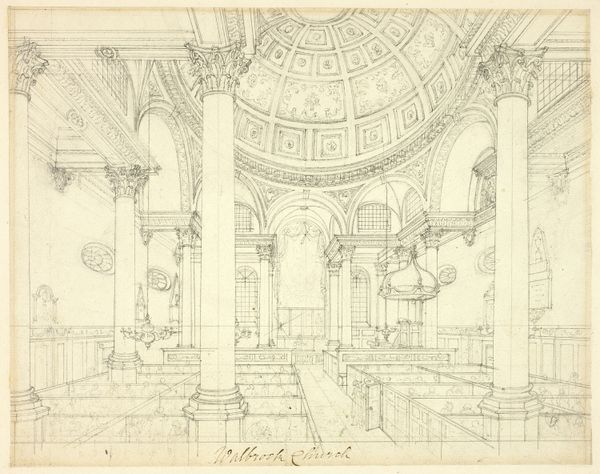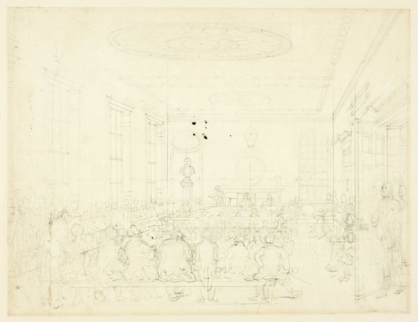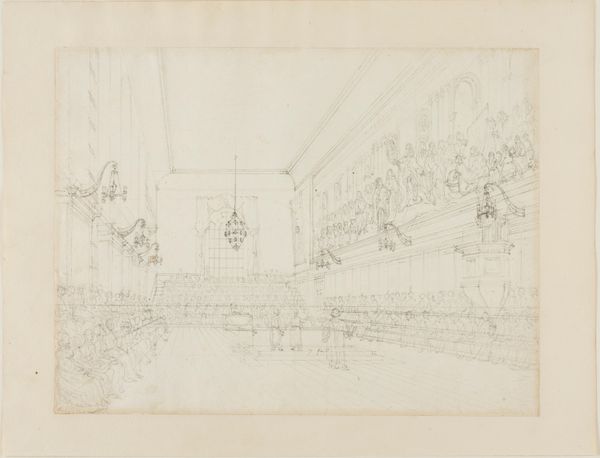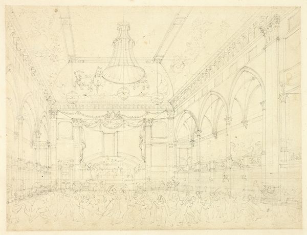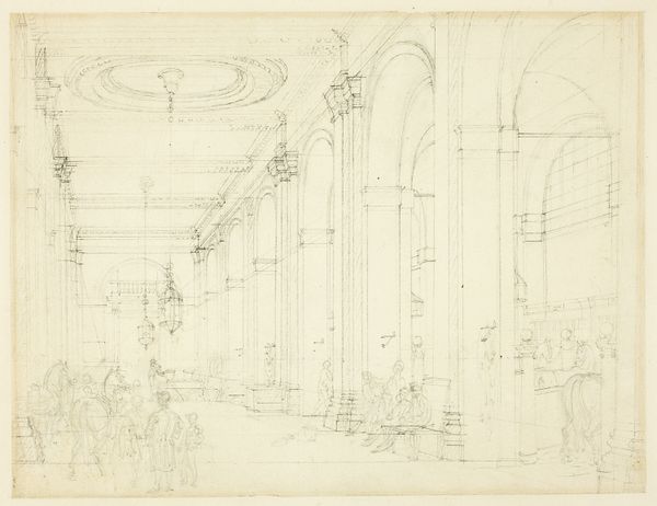 Editor: Here we have Augustus Charles Pugin's "Study for Surrey Institution, from Microcosm of London," dating from around 1809. It's a graphite and etching piece, quite detailed for its size. It strikes me how the artist meticulously rendered the interior architecture. What stands out to you when you look at this? Curator: It’s a fascinating glimpse into the labor of representation, isn’t it? Consider the graphite— a readily available material, almost industrial in its commonality—used here to depict the aspirations of Neoclassical London. How does the process of etching, this repeatable method, democratize or perhaps commodify the architectural ambition? Editor: That's interesting – framing it as a sort of architectural commodity. I hadn’t thought of it that way. So the choice of etching enables mass production and broader access to the image of this institution? Curator: Exactly. And beyond mere reproduction, let's consider the social context. The Surrey Institution aimed to provide education and promote the arts and sciences. Who had access to this institution, both physically and through images like this? Were the laboring classes invited to learn, or merely to observe from a distance? Editor: So you’re saying the print becomes a kind of…advertisement? Promoting inclusion, perhaps falsely, depending on who it really served? Curator: Precisely. The materials themselves—the graphite, the etching process, the paper—and their dissemination become tools for reinforcing societal hierarchies, despite the Institution's stated goals. The piece invites us to question whose narrative is truly being represented, and at what cost. Editor: That connection of material to the building's purpose is eye-opening! I’ll never see an etching the same way again. Curator: Art like this reminds us to always examine the materials, the making, and the market forces shaping what we see, and who benefits from it all.