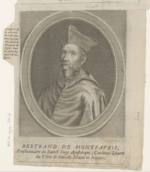 Editor: Here we have Etienne Picart’s 1660 engraving, "Portret van Jean de La Tour". It’s a very linear portrait, and the limited tonal range gives it a certain austerity. What do you see in this piece, approaching it as a formal exercise? Curator: Let us consider the formal structure. The artist employs a limited number of engraved lines to create subtle tonal variations on the prelate's face. How would you describe the texture that the artist is using in his rendering? Editor: I would say it is trying to describe silk or satin – something smooth. Curator: Precisely! Observe how the oval border simultaneously contains and directs the viewer's gaze toward the figure, thereby amplifying his presence. The artist uses an interplay between sharp definition around the face and soft modeling of the robes and head covering to give a subtle hierarchy. What sort of relationship is created by contrasting visual cues in the portrait? Editor: The tight linework emphasizes the subject’s gaze, contrasting with the flatter areas to create depth. The gaze directs our focus, I see that. Curator: Correct. This strategic distribution creates a harmonious balance, a structural principle of design which is at work here. The geometric regularity is further enhanced with its interplay with the baroque curves of the frame. Editor: I see how the balance between lines and tones is what defines this piece! Curator: Yes. Considering form enables a deeper exploration of this historical print!