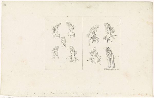 Curator: This pencil drawing is entitled "Twee naakte vrouwen, de rechter met een sluier," which translates to "Two nude women, the one on the right with a veil," attributed to Henri Cameré, created sometime between 1864 and 1894. Editor: Interesting, I'm immediately drawn to the contrast between the figures—one seemingly vulnerable, almost shrinking, while the other has this sense of defiant energy, enhanced by the drapery. Curator: Considering the date, it is possible to view these female figures as emblematic of the artistic exploration of the nude form popular during the academic art movements. It also reminds us of the vital role that sketchbooks played in studios in the late 19th Century as a space of personal exploration and idea development. Editor: I see that. Note how the figure on the right engages the limited space of the page—arms extended—suggesting dynamic movement and a rejection of compositional confinement, while the figure on the left retreats and is less firmly fixed within the piece. Curator: Good point! One could also discuss how the materiality of pencil allows for the swift depiction of form. It is worth acknowledging the social constraints that the artist operated under; his available materials were subject to political forces as they traveled through his studio. Editor: Yes, the formal language suggests an intention, despite its sketchy nature. Consider the expressive lines, the composition, the suggestive use of light and shadow—all creating distinct impressions of gesture and intent. What kind of statement could Cameré be attempting through juxtaposing those forms? Curator: I suppose, if we broaden the question to his likely patrons, we could also wonder about what statements *they* might have been looking for, by commissioning works with those gestures and intents, at a moment of rapid social and technological transformation in Paris. Editor: In any case, it is through works like this drawing that we can really think through our role of viewing. What this sketchbook study lacks in grandeur, it more than compensates for through an honest exploration of forms in space and light. Curator: Indeed, considering the historical forces under which its graphite was mined and distributed reminds us how simple tools like pencil, and unassuming art, can reveal hidden worlds.