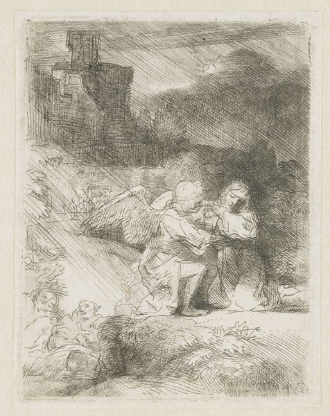 This etching of the Agony in the Garden was created by Rembrandt van Rijn. Observe the angel comforting Christ, his hands clasped in prayer as he kneels in the Garden of Gethsemane. This gesture, a universal expression of supplication, transcends time. We see echoes of it in ancient sculptures of pleading figures and Renaissance paintings of saints in devotion. Consider how the motif of hands clasped in prayer has evolved. In early Christian art, it symbolized humility. Yet, in different cultural contexts, the same gesture can signify desperation. The emotional weight of this scene is palpable, Christ's internal struggle externalized in the dramatic chiaroscuro. Rembrandt captures the psychological tension through the image of an angel, which engages viewers on a deep, subconscious level. The recurring motif reflects our collective anxieties and hopes, demonstrating how artistic expression is bound by human emotions. The visual language serves as a bridge connecting us to past generations.