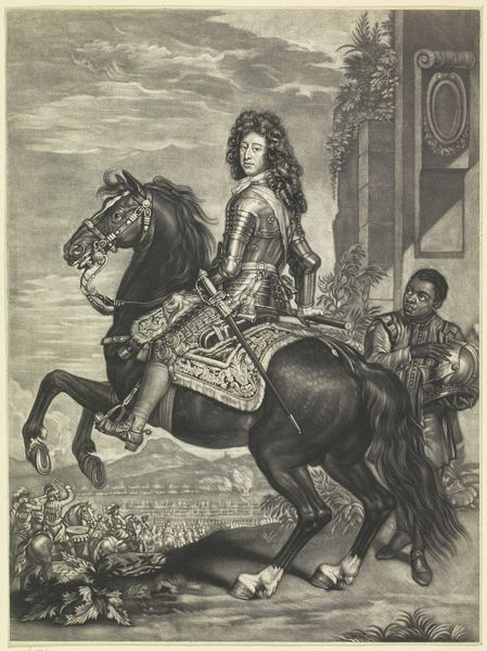 Editor: This engraving, dating roughly from 1658 to 1672, presents a "Portret van Leopold I, keizer van Duitsland" by Theodor van (II) Merlen. The detailed linework captures Leopold in full regalia on horseback. I’m immediately struck by the idealized depiction of power – what layers of historical and cultural meaning do you see embedded within this image? Curator: The key to this piece is to acknowledge the narratives it’s deliberately constructing. We see Leopold presented as a divinely appointed ruler, symbolised by the cherub bearing his coat of arms. This imagery attempts to legitimise Habsburg power during a period of significant upheaval and conflict. The art overtly promotes the monarchy’s power and attempts to shape perceptions of its reign. Editor: It’s interesting to note that while presented heroically, he seems somewhat detached from the battlefield unfolding in the background. What does this contrast suggest? Curator: That tension is central. The foreground emphasizes Leopold’s supposedly inherent right to rule, somewhat masking the contested realities of 17th-century European politics. Ask yourself who the image is aimed at and how it attempts to create a unifying image of imperial power amid very fractured lands and identities. It prompts questions about propaganda, the creation of national identity and how conflict informs these projections of leadership. Editor: So, beyond being a portrait, it’s a carefully constructed argument about power, presented through symbolic imagery and its artistic style? Curator: Precisely. It's about understanding how power is performed, visualized, and ultimately, consumed by different audiences. The engraving reveals how Baroque aesthetics and symbolism are put into service of ideological programs. What do you think we can learn by situating the image amongst others of that period that portrayed different, even opposing leaders? Editor: Thinking about it that way, I realize there's much more to this than just a picture of a king on a horse. It’s a carefully staged scene meant to evoke certain feelings and legitimize Leopold’s rule, within the very specific historical conditions. Curator: Exactly, and by decoding those visual strategies, we understand more about not only Leopold’s reign, but also about the persuasive and often manipulative role of art in shaping history.