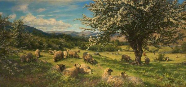 William Sidney Cooper made this oil painting, "Sheep," at an unknown date. Look at the fur; each sheep looks as though it has had its coat sculpted rather than painted, capturing their woolly essence! Cooper's mark-making feels very deliberate here, not random. The overall tonality is soft, like a warm memory. A sleepy, sun-drenched afternoon is evoked with a hazy, muted light. If you study the painting closely, you can see how Cooper creates depth through subtle shifts in tone and detail; for example, the texture of the grassy bank in the mid-ground that slopes down towards the beach. The green is broken up with browns and yellows. These details draw us into the pastoral scene. Cooper was a prolific landscape painter, and this piece is typical of his wider oeuvre. Like many of his contemporaries, such as John Constable, he had an affection for rural scenes, finding beauty in the everyday. It embraces ambiguity, inviting us to bring our own experiences and interpretations to it.
