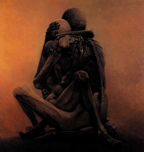 Curator: This “Untitled” piece is by Zdzislaw Beksinski and uses oil paint, exploring themes of figuration within a surrealist style. What are your initial thoughts? Editor: Striking! The earth tones create a desolate mood, almost sepulchral. The subject's form, fragmented and blocky, sits heavily on the bench. Curator: Beksinski was known for his dystopian imagery. Consider the materials used, the thick layering of oil paint contributes to that oppressive feeling. Each layer seems like another burden weighing down the figure. Editor: Absolutely. And notice the strategic use of light; it almost feels caustic, illuminating only certain planes and edges. It enhances the figure’s already jarring geometric construction, reducing the figure to component shapes, and almost resembles patchwork or crude architecture. Curator: He manipulated materials not only for aesthetic value but also as a metaphor. The very act of layering, texturing, and almost obscuring represents themes such as decay. Editor: I agree, the textures are also so tactile. One can almost imagine feeling the weight of those stone underfoot. It grounds the figure, but also traps him. Curator: Beksinski worked without titles, leaving interpretation open, thus involving the viewer. Perhaps the work reflects the individual’s experience in a world rapidly shifting under technological and societal pressures. Editor: Indeed, a fitting sentiment captured by color, construction, and light that echoes the symbolic language. It’s a captivating expression—unsettling but thought-provoking. Curator: So, looking closer, we’ve considered not only the visual and technical execution but also a deeper material and societal context in interpreting the piece. Editor: Exactly. And from that framework, we’re able to engage not only our gaze, but hopefully an emotional understanding, even empathy.