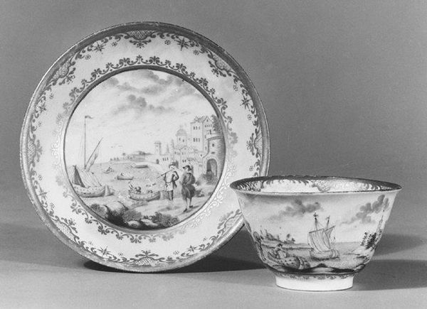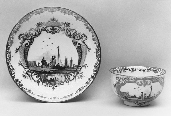 Curator: Before us we have a "Teabowl and saucer" created between 1739 and 1753 by the Meissen Manufactory. The set is a testament to the intricate craftsmanship possible with porcelain, featuring delicate painted scenes. Editor: It strikes me immediately as having a reserved quality; its monochrome palette cultivates a rather serious and muted tone. The fine brushwork in these miniature landscapes, though, is remarkable. Curator: Absolutely. Consider the social context: tea culture was burgeoning in Europe. Porcelain became deeply entwined with status and colonial trade. Examining the painted scenes on both pieces reveals insight into European perspectives on labor and the lives of individuals in port cities, hinting at commerce and potential exploitation within trade routes. Editor: Yes, the landscapes presented appear quite detailed for such a small surface, and the overall composition is engaging: each decorative element is thoughtfully positioned, the balance between empty space and form contributes to a harmony. Did the decorative schemes on functional wares affect pictorial landscape art overall? Curator: In a sense. Objects such as this enabled the circulation of imagery and influenced design sensibilities. Analyzing this porcelain in conversation with class, gender, and global exchange underscores its cultural and economic resonance in society. Who got to enjoy such refined scenes on a daily basis? How did ownership impact class and labor dynamics? Editor: I concur. We can find evidence that landscape and figurative works for high society often found their ways to lower echelons as patterns of imitation became ubiquitous across media in decorative applications, fabrics, and beyond. Still, I remain awestruck by the composition and fine materiality of the teabowl set and its decoration, creating a harmonious balance of tones. Curator: By interrogating objects such as this—from aesthetic design to historical context—we might gain greater appreciation for labor relations and societal structures reflected in something as commonplace as the afternoon tea service. Editor: Precisely; to consider both its formal aspects, alongside its material origin, has enriched our encounter.