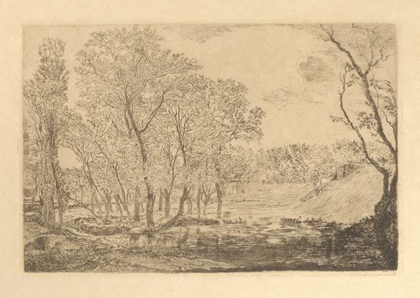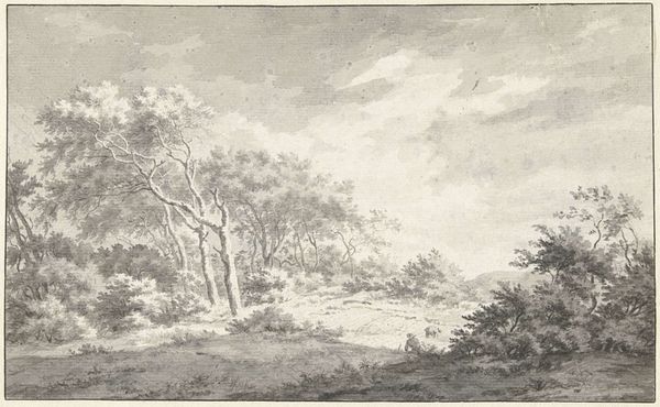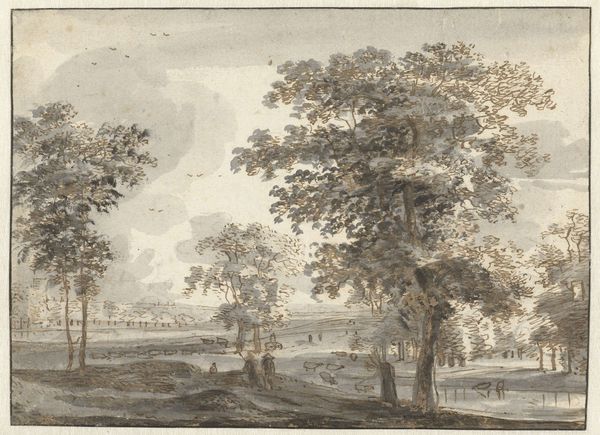 Curator: Here we have "Landschap," a landscape drawing created sometime between 1610 and 1653 by Simon de Vlieger. Editor: Wow, there's something instantly calming about this sketch. The muted tones, the almost dreamy way the trees are rendered...it's like a whisper of nature. Curator: Indeed. Vlieger's work sits at a fascinating intersection. He predates the kind of industrial and urban expansion that would define the later Dutch Golden Age, yet we see in this drawing, this attention to detail – a nascent consciousness of land ownership and maybe even anxieties around the concept of 'nature' itself. Editor: You're thinking about the control humans exert? I get more of a feeling of being *in* nature, of the trees having agency. I can almost smell the damp earth. Look how the light filters through the leaves; it feels very intimate, even though it's a broad scene. Curator: But even this sense of intimacy isn’t without context. The rendering of light is deliberate, certainly—drawing influence, maybe, from the evolving ideas about the importance of scientific observation during the 17th Century. The level of naturalism suggests a societal shift, away from symbolic landscapes towards detailed realism. This resonates with a growing emphasis on reason. Editor: Reason, huh? For me, it is just such a romantic little moment! Maybe that says more about me than Vlieger! Curator: Maybe, but that’s the power of art. It continues to converse with us, no matter the gap in centuries. Editor: Agreed! It's cool to think something made so long ago can still spark completely different ideas! I still see peace and fresh air, while you're breaking down the historical implications. Beautiful.