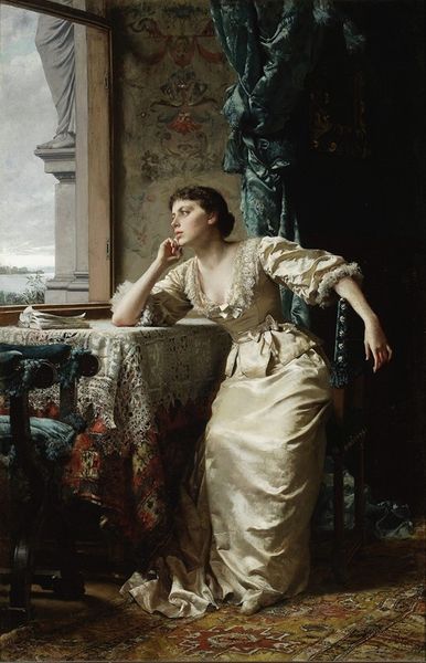 Editor: So, this is James Tissot's "Woman in an Interior," painted in 1885 using oil on canvas. It's...striking. She's indoors, but all that light from the window suggests a world beyond. What do you see in this piece, beyond the surface? Curator: I see a portrait, yes, but also a complex symbol of societal expectation. Windows, especially, often represent a longing for something more, or a boundary between inner and outer life. How does the woman's posture strike you? Is she leaning in or pulling away? Editor: Hmm, I hadn’t considered that. I guess she seems... detached? Her gaze isn't really engaging us, and she's kind of slouched. It makes her seem a little bit trapped, even with that bright window behind her. Curator: Precisely. Tissot often uses symbolic positioning like this. What kind of interior space do you think this suggests? A sanctuary? A prison? The Victorian era, remember, had very defined roles for women. Editor: A little of both, maybe? The dark heavy drapes suggest a kind of protection, while the position of the chair, as if boxed into the window’s corner, hints at confinement, a separation from vitality. What about her jewellery? It looks heavy. Curator: Indeed, think of jewellery in this context. Is it adornment or a chain? Every object tells a part of the story. Her expression, her setting… how much choice do you think she really has in her life? Tissot doesn't offer us simple answers. It becomes an enigma; we see that freedom and enclosure, light and shadow, mingle. Editor: That's a powerful way to look at it. I was just seeing a lady in a room, but it's clearly more about societal expectations than interior decoration! It's so interesting how an image can have so many layers. Curator: Visuals provide access to deeper understanding, giving tangible form to intangible ideas. Each object speaks to something beyond itself. Thank you for unpacking all that the image gives to us.