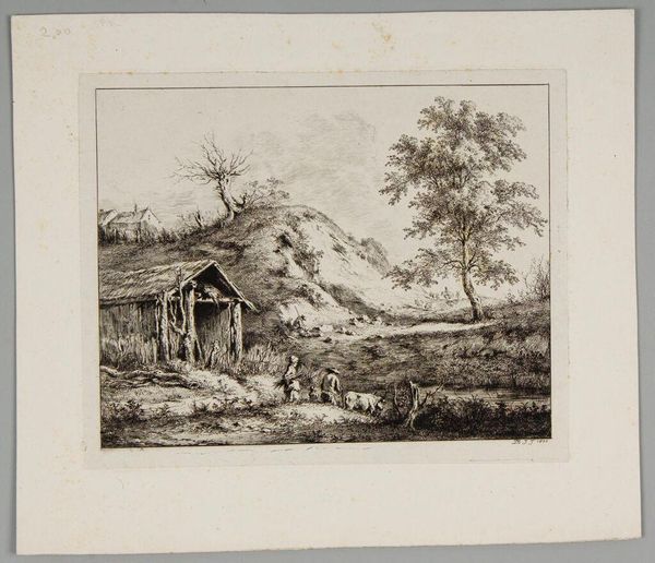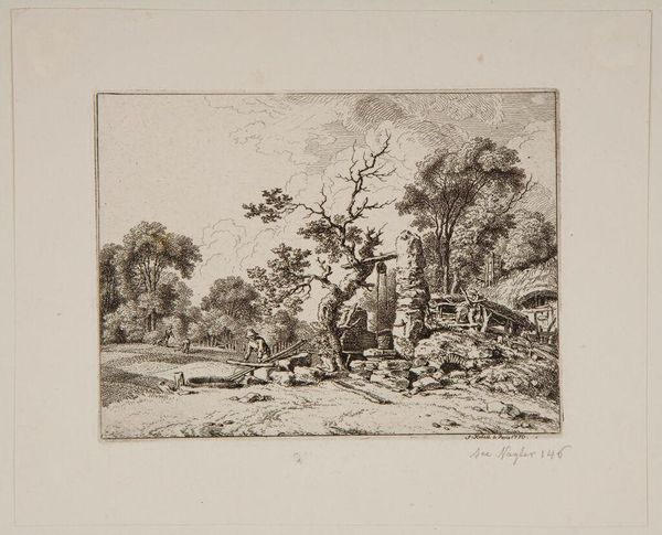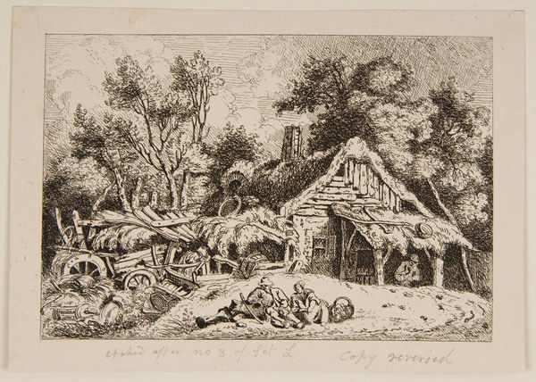 Editor: Ferdinand Kobell's "Isolated Farmhouse" presents a detailed scene. There’s a rider and people gathered outside this modest thatched house. What visual stories do you think the symbols and imagery are trying to tell us? Curator: Notice how the farmhouse is nestled amongst these old trees, almost swallowed by them. The house itself becomes a symbol of shelter and resilience. It suggests a deep connection to the land, a cultural memory of rural life. What emotions does this evoke in you? Editor: A sense of peacefulness, but also a little lonely. Curator: Indeed. Consider the figures – their placement relative to the house. Are they integrated or somewhat detached? This tension between community and isolation, nature and culture, speaks volumes about our evolving relationship with the landscape and ourselves. What stays with you most after viewing this? Editor: The way the house seems both protected and overwhelmed by the trees. It makes you think about our place in the world.