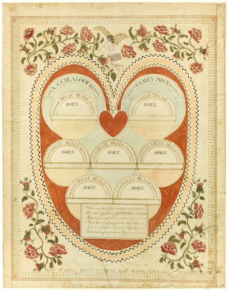 Editor: Here we have "Family Register," created in February 1813 by William Murray. It's a mixed-media drawing on paper and I find the use of hearts and floral designs very appealing. What stylistic features stand out to you? Curator: Notice the composition—the strategic placement of hearts, geometric figures, and text within a decorative border. The symmetrical arrangement gives it a sense of balance, wouldn't you agree? How does the contrast of red, blue and browns across the hearts create hierarchy and visual impact? Editor: I do see that now! The use of colour to emphasize some family members while obscuring others in darker colours is intriguing. Does that speak to you about how the artist feels about some figures relative to others in this familial composition? Curator: Consider the intrinsic value of each component. It's as if Murray constructs not merely a document but also a subjective appraisal of the family's interrelationships. Would you say it elevates mere information to an experience? Editor: Yes, by focusing on structure and symbolism, it seems that Murray infuses the objective family record with subjective emotions, blurring the boundary between representation and expression. It feels both informative and surprisingly personal. Curator: Precisely! We see Murray using formal artistic means, not just to document, but to comment on relationships within the family sphere. It underscores how folk art traditions like this served as a medium for communicating personal stories, rather than objective realities, something that is often lost on audiences viewing the piece at first. Editor: So by paying attention to form and visual vocabulary, we can better unpack the personal narratives embedded within seemingly simple family documents! Curator: Indeed! The power lies within the meticulous artistry.