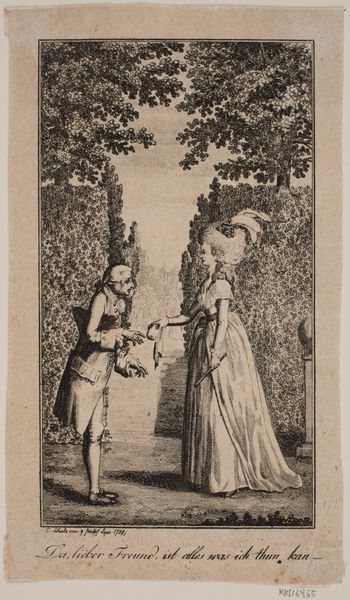 Daniel Nikolaus Chodowiecki created this print called 'Dame als bruid' whose title translates to 'Lady as Bride', using etching techniques. Chodowiecki was working in the 18th century during a time of immense social and political upheaval, particularly the Enlightenment, which emphasized reason and individualism, yet maintained a strict class structure. In this print, we see a couple standing together in what appears to be a park-like setting. The woman, presumably the bride, is dressed in a simple, flowing gown, while the man is in a more formal coat and breeches. They are presented as equals, yet there is an undeniable formality and constraint. How might the institution of marriage, a cornerstone of societal structure, reinforce class divisions? What freedoms, or lack thereof, did women experience within these unions? Chodowiecki’s work invites us to consider not only the visual narrative but also the underlying social norms that shape our understanding of love, duty, and identity.