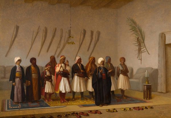 Jean-Léon Gérôme created *Whirling Dervishes* using oil on canvas sometime in the 19th century. Gérôme's method here exemplifies a meticulous academic approach, in which the effects of light and shadow are harnessed to create a strong illusion of depth. This is achieved through careful layering of paint, creating varied surface textures that mimic reality. The tight brushwork and attention to detail, seen in the rendering of the figures’ garments and facial expressions, demonstrate a commitment to realism, while the scene itself is an exercise in Orientalism – a Western fascination with the cultures of the Middle East. The material’s smoothness belies the labor involved. Gérôme, like most academic painters, would have spent years mastering his technique, learning to mix pigments, prepare canvases, and apply paint with precision. This painting, therefore, is not just a representation of a scene, but also a testament to the skill and training required to produce such a work in the 19th century. The focus on materials, making, and context helps us to understand the artistic skill, social context, and cultural dynamics that shaped this work.