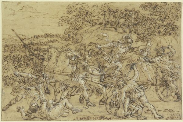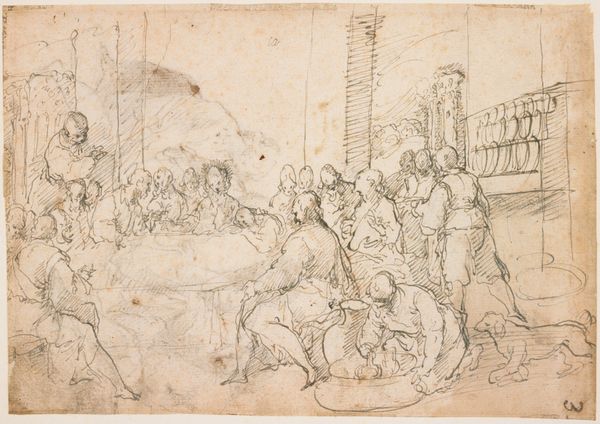 Hanns Lautensack created this landscape with Christ and the Centurion of Capernaum using pen and brown ink. The artist's choice of drawing as a medium is significant here. Unlike painting, drawing allows for a directness and immediacy, capturing the artist's first thoughts and gestures. The delicate lines, cross-hatching, and shading bring depth and texture to the buildings and the landscape, yet it lacks the materiality and weight of other artistic practices. Lautensack's skills reveal the value placed on the intellectual and conceptual dimensions of art during this period. Pen and ink drawing required a high degree of skill and control. The precision of the lines and the detailed rendering of the landscape suggest hours of patient labor. This contrasts sharply with the story being told, in which Christ can heal the Centurion's servant with a single word, without laborious effort. Considering the material, making, and context invites us to look beyond the narrative. It allows us to appreciate the artist's hand and skills, and to engage with this artwork beyond traditional distinctions between fine art and craft.