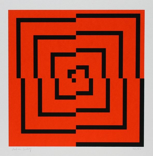 Curator: Victor Vasarely, a leading figure in the Op Art movement, created "Kaldor" in 1980. It’s a print, and what strikes me immediately is the use of vibrant colours in creating a spatial illusion. Editor: Yes, it’s visually arresting. My first thought is that the work plays with architectural space, or rather a deliberately impossible version of it. The tiling is suggestive of labor-intensive building techniques that, in reality, might never achieve these impossible contortions. Curator: Absolutely. Op Art, as a style, really gained traction during the 1960s, reflecting a period of intense social and political change. Think about the rise of consumer culture and how artists responded by playing with perception and creating experiences that challenged viewers. Editor: Interesting that you mention consumer culture because that connects strongly to the means of production. This looks like it could have been produced in larger runs which then, ironically, democratizes a design object like this. Curator: I agree, there's an interesting contradiction. But it also fits the spirit of the era: experimenting with how people interact with art and environments in an era that valorized art movements tied to social values like pop art. The work situates itself within questions around industrial design and reproducibility, while creating these incredible illusions of volume and depth. The sphere on the back wall seems both recessed and pushing forward! Editor: Exactly, it disrupts traditional notions of artistic skill by emphasizing industrial process and questioning art's uniqueness. Consider the screen printing needed. There is labor involved in those materials that often gets obscured. Curator: What strikes me is the sense of play with the ideas of postmodernism; is there meaning in this work other than its existence as pure play of shapes? Are there social commentaries in its visual trickery? Editor: I think that you bring up a key aspect of conceptual art when you ask about play. Is Vasarely highlighting a new kind of labor within design? Curator: So, considering all this, how does "Kaldor" sit within Vasarely's larger body of work and Op Art in general? Editor: "Kaldor," for me, emphasizes a breakdown of art historical hierarchy, offering new interpretations about craft and challenging material realities. Curator: For me, "Kaldor" stands as a vibrant reflection of a transformative period, a time of shifting cultural values and an exploration of new ways of seeing and experiencing the world.