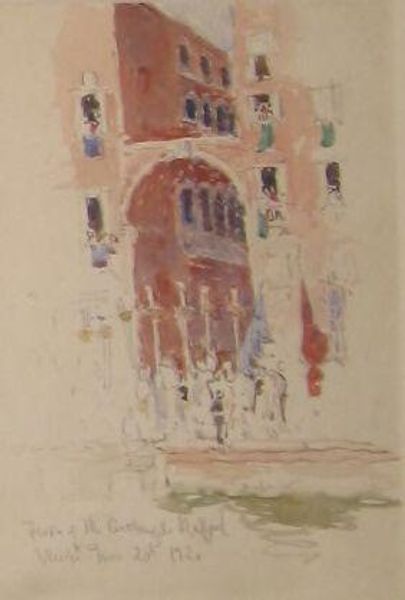 Curator: Denman Waldo Ross presents "Tower, Naples, Italy," a watercolor where the architecture rises gently from the page. Editor: It feels airy, almost dissolving. The pale washes give it a fleeting, dreamlike quality. Curator: Ross was deeply interested in color theory and how colors interacted to create harmony. He developed a system of color based on measured gradations. Editor: Yes, but the color is almost secondary. The composition, with its layering of forms and the deliberate placement of the tower, directs the eye upward. Curator: Ross’s social standing and artistic theories were intertwined; he advocated for art’s accessibility within education and society, aiming to elevate public taste. Editor: Yet there’s something very private and intimate about this small work. It's a personal record of a place, distilled to its essence. Curator: It’s a testament to how personal experience shapes our understanding of a place within a specific historical framework. Editor: I'll remember the atmospheric perspective—a gentle reminder of time and place.