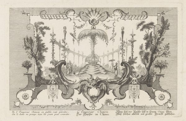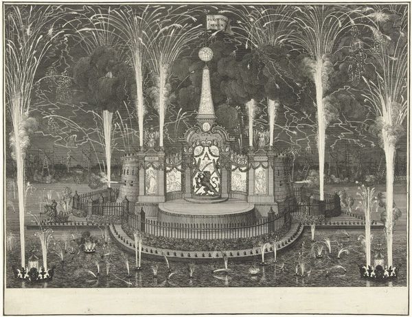 Daniël Stopendaal created this etching titled, "Fireworks at the celebration of the Peace of Utrecht," in 1713. The artwork has a monochromatic palette, dominated by fine lines and intricate details that capture the ephemeral nature of fireworks. The composition is structured around a central monument, flanked by symmetrical displays of fireworks. This creates a sense of balance, but also tension between the static architecture and the dynamic, explosive displays. The formal arrangement conveys a complex interplay between chaos and order, reflecting the historical context of the Peace of Utrecht, which sought to establish a new European order. The fireworks, with their fleeting bursts of light, can be interpreted as visual signs of transformation. The use of symmetry and perspective organizes the visual field and invites the viewer to explore themes of peace, celebration, and the transient nature of historical moments. Consider the monumentality and the ephemerality of the fireworks. They together articulate the core of the print's structural concerns. They draw our attention to a moment of negotiated order, rendered through transient bursts of light and shadow.