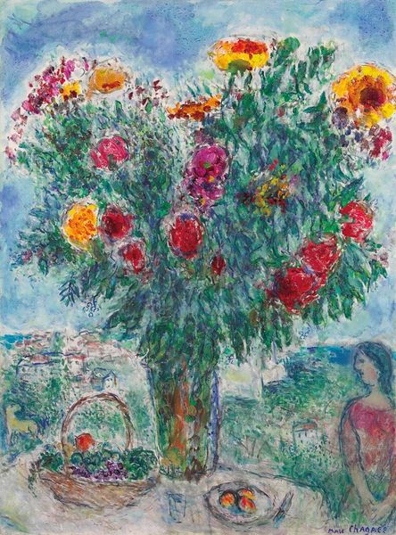 Editor: Here we have Marc Chagall’s "La nappe mauve," painted in 1972, using oil paint. The textural quality of the impasto seems really prominent to me, especially in the flowers. What draws your attention when you look at this piece? Curator: My eye is drawn to the tangible quality of the paint itself, how Chagall builds up these thick impasto layers. It’s less about depicting a bouquet realistically and more about showcasing the physical properties of the oil paint and his active handling of it. Do you see how the 'mauve tablecloth' acts almost like a stage, highlighting the labor and materials? Editor: Yes, I hadn’t considered the "tablecloth" like that, more like a compositional element, but I see what you mean. The brushstrokes are almost performative. How does that materiality tie into its broader context? Curator: Chagall was working during a time when the definition of art was being radically questioned. By emphasizing the process, the ‘making’ of the painting, he's challenging the traditional separation of “high art” from craft. Think of it: He elevates the mundane, highlighting the materiality often overlooked in favor of subject matter or symbolic meaning. He’s less concerned with the what and more concerned with the how. How the pigment, ground from the earth, comes to form and represent meaning. Editor: So, the painting itself becomes a record of its own construction and maybe even a comment on art production as a whole. I guess that's different than how I initially approached it, looking for symbolic narratives. Curator: Precisely. It prompts us to think critically about labor, the commodification of art, and what constitutes artistic value beyond the representational. The rough texture of the medium challenges us to value its pure form before finding a deeper reading. Editor: This material-focused reading really changes my perspective. It’s less about dreamy symbolism and more about the physical act of creation. Curator: And about placing value on that process. I’m glad it resonates with you.