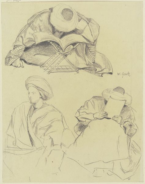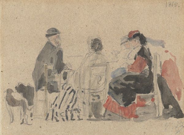 Curator: This delicate watercolour is titled "Spinning Room in Schwalm," created by Jacob Happ in 1895. It's part of the Städel Museum collection. Editor: My immediate impression is one of muted colors and repetitive motion. There's something quite somber and subdued about the atmosphere, despite the presence of so many figures. Curator: Jacob Happ, though lesser-known, was painting during a time when genre painting, depicting everyday scenes, was shifting toward capturing specific social dynamics. He studied at the Düsseldorf Academy, reflecting that school’s focus on naturalism mixed with idealism. Editor: Exactly! This artwork depicts a group of women, all similarly dressed, engaged in spinning. I see themes of labour, perhaps even the constraints placed on women’s roles within a particular community. The identical caps are symbolic to me, and the downward gazes certainly reinforce that reading. Are they celebrating their skills, or being subjected to exploitation? Curator: Happ likely wanted to document the traditional crafts of rural communities. Genre paintings were becoming increasingly ethnographic; the artwork would have had an audience fascinated by supposedly authentic lifestyles removed from industrialized cityscapes. He's visually recording what he perceived as a vanishing world. Editor: That fascination is precisely what makes me uncomfortable. It borders on voyeurism and reinforces power imbalances, particularly the viewer as privileged observer gazing upon supposedly quaint, rural labourers. Who were these women, beyond subjects in a painter’s composition? I'm asking, does the artist attempt to give the figures dignity beyond mere subject matter? Curator: The medium itself - watercolor - is interesting here. Watercolor lends itself to fleeting impressions, mirroring the perceived ephemerality of these traditional crafts and potentially reinforcing a nostalgic narrative. He also utilizes line to give each women unique details of physiognomy; it humanizes the uniformity of labor. Editor: The sketch-like quality is striking, contributing to that sense of an immediate impression, and leaving so much open to interpretation and debate, but yes it remains locked to a vision and not voices of the subjects. It does underscore the value of critical inquiry when approaching art rooted in ethnographic documentation. Curator: Ultimately, Happ’s watercolour provides a window into a particular time and its anxieties, mediated through the artist's hand and presented for a viewing public steeped in its own biases. Editor: It urges us to delve deeper and explore the many untold narratives that resonate within.