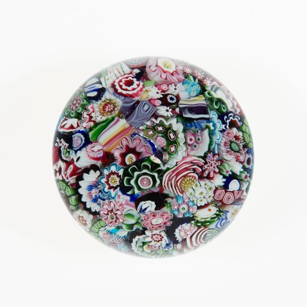 Curator: At the Art Institute of Chicago, we're lucky enough to have this utterly charming paperweight, dating from around 1845 to 1860 and crafted by the Clichy Glasshouse. Editor: It's like holding a whole universe in your hand, isn’t it? A galaxy of tiny flowers all swirling together, frozen in glass. There's such controlled chaos here, like nature herself was miniaturized. Curator: Exactly! The Clichy Glasshouse was known for its millefiori paperweights. "Millefiori" literally means "a thousand flowers" in Italian, and it refers to that technique of creating intricate designs from glass rods. What seems purely decorative actually sits within a very calculated commercial structure focused on desirable goods. Editor: You can see that. It's decorative, yes, but also kind of hypnotic. Those little flowers seem to float inside this perfectly clear dome. I mean, it's hard to imagine anyone actually using it to hold down papers. Curator: Well, its initial popularity reveals a burgeoning Victorian middle class who could afford little luxuries for the home, items which symbolized domesticity and taste. Beyond mere function, objects like these reflect shifting societal values surrounding consumption. Editor: I find myself just wanting to stare into it, let my mind wander through those layers of color. The craft feels less technical when there’s all that beauty coming forward. Is that terrible? Curator: Not at all! The skill required to produce such detail *is* staggering, though. But thinking about access makes me realize we need to look more closely at why these kinds of glassworks become such objects of desire and social importance. Editor: All this just from one tiny object. So much held within. It just shows how art is a reflection of both what we see and what we imagine. Curator: Absolutely. The context changes but these things resonate throughout history. Editor: I will always want to bring something beautiful back home, for myself and for others.