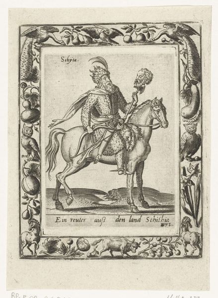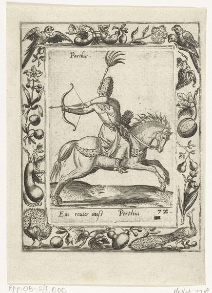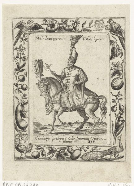 Editor: Here we have a print called "Mammeluk te paard," created around 1577 by an anonymous artist, currently residing at the Rijksmuseum. It's done using etching and engraving, a Mamluk warrior, looking formidable upon his horse. It's all quite striking. What are your initial thoughts about this print? Curator: This print is fascinating, especially considering the historical context. In the late 16th century, Europe's understanding of the East was heavily mediated through travelogues, diplomatic exchanges, and, of course, artworks. The "Mammeluk te paard" embodies this fascination, presenting the Mamluk – a warrior class that held power in Egypt for centuries – through a distinctly European lens. Editor: So, it’s less about realistic representation and more about… projection? Curator: Precisely. How might the print’s imagery reinforce existing power dynamics and cultural biases? It uses a very specific artistic language influenced by Mannerism, also displaying a vision filtered through prevailing social, political ideas of the period. The surrounding frame, filled with what appears to be both familiar and exotic fruits and animals, further contributes to the narrative, exoticizing the subject within a controlled European framework. The Mamluk warrior is presented, but is he understood? Editor: It feels like viewing another culture from a distance, like a theatrical staging. So, who do you think the intended audience of such imagery was? Curator: Likely an aristocratic and scholarly class, eager to consume images from far away lands. Consider the role these images played in shaping European identity by creating this image of the Other. They reinforced European identity through exoticized representations of cultures far away. Editor: I see how the piece creates an imagined version of a different culture. This really offers a different insight on what I understood of representation. Thanks for helping me understand how history shapes art's reception! Curator: And thank you for exploring this intricate dance between representation and historical power!