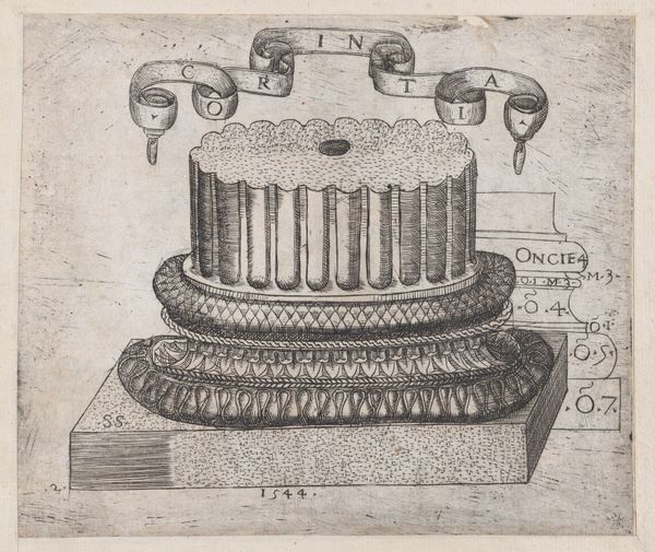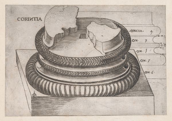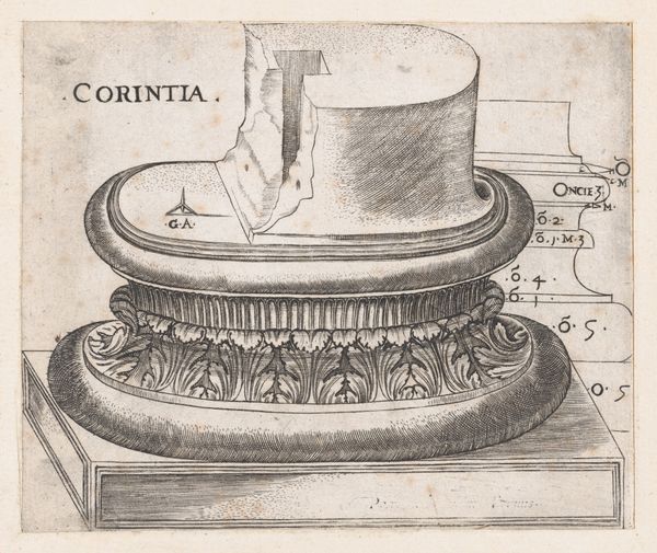 Curator: Here we have a print titled Speculum Romanae Magnificentiae: Ionic base, created between 1534 and 1540 by Monogrammist G.A. & the Caltrop. This engraving, currently residing at the Metropolitan Museum of Art, presents a detailed architectural study. What are your first thoughts? Editor: My first thought is: wonderfully obsessive! All those tiny, intricate details. I mean, it's just a base, but look at how much love went into documenting every leaf, every curve. It feels both precise and wildly imaginative at the same time, like a botanist dreaming of temples. Curator: Indeed. The cross-hatching is particularly effective, providing a sense of depth and volume. Note how the geometric precision of the base contrasts with the organic forms of the foliage. Semiotically, the Ionic base symbolizes knowledge, and it is used here to provide accurate measurements. Editor: Measurements! Ah, that explains the annotations on the right edge there. Makes it less dreamy, more like a master builder’s notebook. I was so caught up in the visual, I nearly missed them. But now I wonder about the choice of plants and leaves. Did they carry any symbolic weight or are they just for show? Curator: While we cannot state the symbolism with certainty, we must appreciate that the plant representations do show close observation. This image stands not only as an architectural study but also as an artifact reflecting the meticulousness valued during the Renaissance. The artist presents a distillation of both the natural and the man-made, each dependent on formal considerations of shape, line, and, indeed, light. Editor: Yes! It's that meeting of the structural and the organic. Thinking about the artist, I'm curious. What kind of person obsesses over column bases? Did they spend days wandering among ruins, squinting at crumbling capitals? Curator: That speculation provides a bridge to interpreting its function in the context of the Renaissance interest in classical antiquity and reconstruction, and in considering it within its artistic context, one must also regard its structural significance within the evolution of architectural knowledge. The print exemplifies the spirit of investigation and documentation that defined the period. Editor: So, it’s not just a pretty picture; it’s a piece of history about how people in the Renaissance saw their past. Well, now I see more than just details—I see a story about obsession, rediscovery, and the very human desire to build something lasting. Thanks for pointing out those structural details; now, next time I see an Ionic column, I’ll have to pay it some respect.