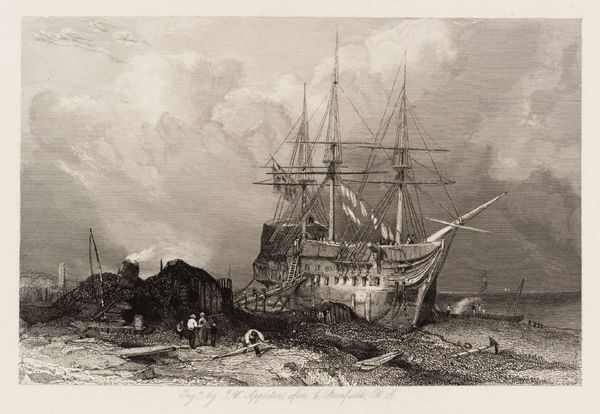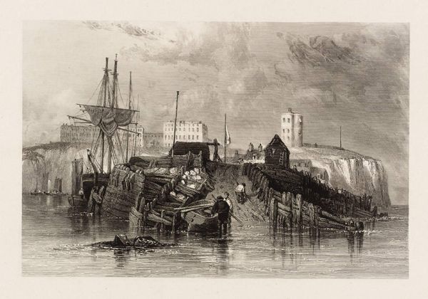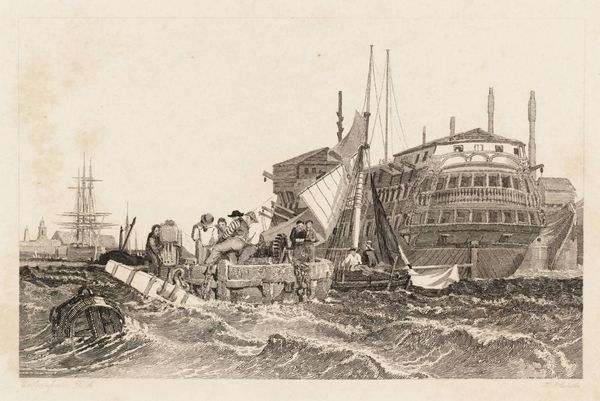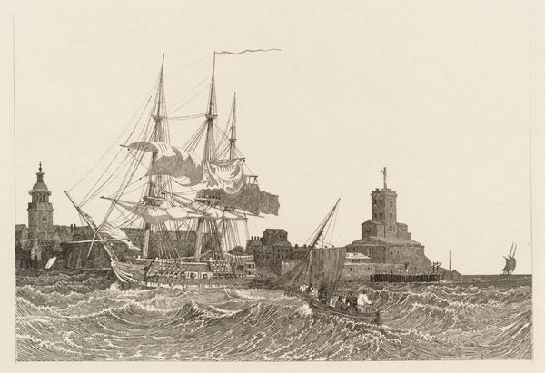 Editor: This is Clarkson Stanfield's "The Semaphore, Portsmouth," an engraving, currently residing at the Tate. The choppy waves give the piece a sense of urgency and movement. How do you interpret the social context of this maritime scene? Curator: It evokes Britain's naval power, doesn't it? But let's consider Portsmouth itself – a port city shaped by colonial expansion and trade. This isn't just a pretty picture; it’s a snapshot of a society built on global power dynamics. Editor: So, you're saying it reflects the political landscape of the time? Curator: Precisely. The semaphore tower itself symbolizes communication and control, tools crucial for maintaining an empire. It makes you think about who benefited from all this "progress," doesn't it? Editor: Definitely gives me a different perspective. Thanks! Curator: My pleasure. It's about seeing beyond the surface, questioning the narratives that art often silently upholds.
